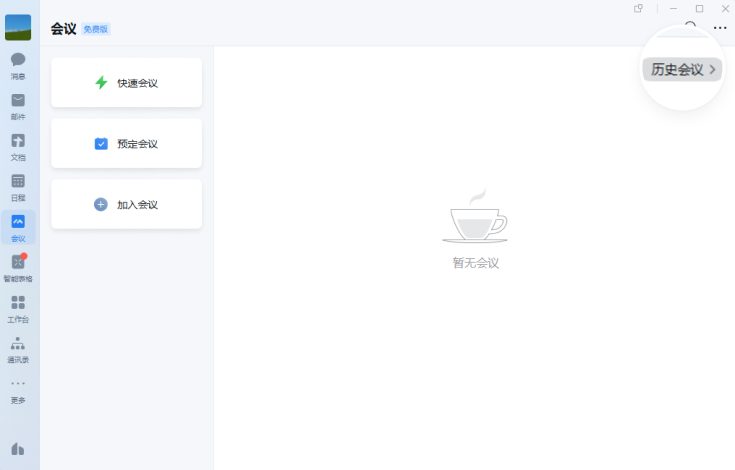 成员可在【客户端->会议->历史会议】中查看历史会议记录。