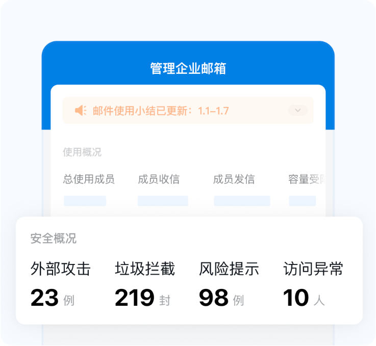 不仅员工收到可疑邮件有风险提示,企业管理员还能定期监测公司收到的垃圾邮件、风险邮件,管理员每周都能收到邮箱数据统计,可以查看企业本周成功拦截了多少封垃圾邮件,如需要进一步了解,也可以点击查看垃圾和风险邮件的摘要,后续提醒员工注意防范。