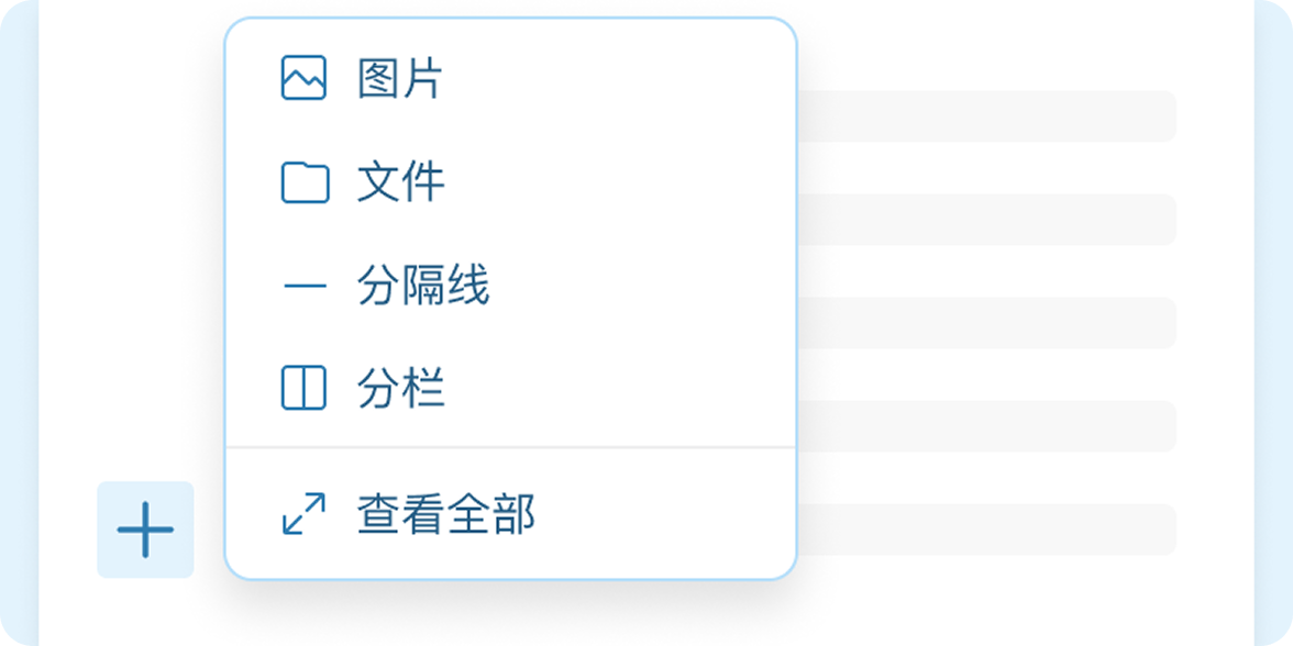 点击段落左侧「+」可添加图文、表格、文件等丰富的内容组件,简单拖拽就能灵活布局