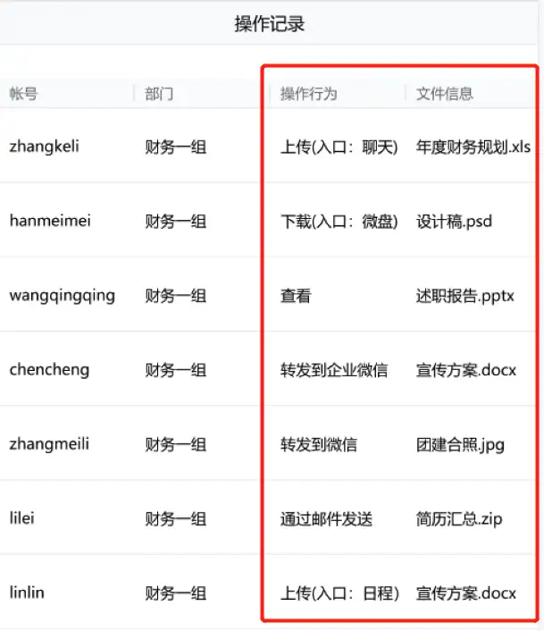 开通企业微信安全高级功能后,企业管理者能够在操作日志中查看到文件的上传与下载,查看与转发的记录,上传下载转发去哪里都可以清楚查到,如若有员工泄漏机密文件,能够第一时间帮助追责。