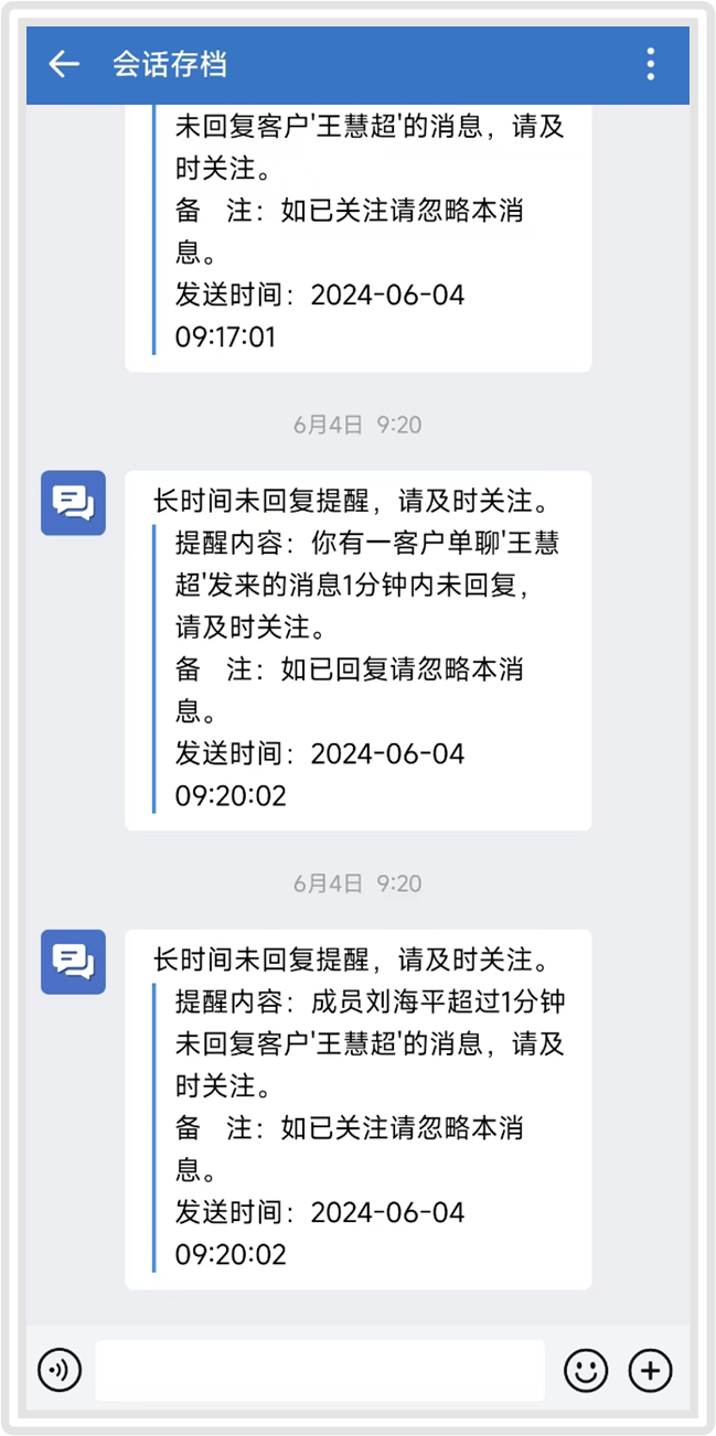 企业还可自定义员工不回复时长限制,也可选择接收提醒的相关人。超时回复可以自动提醒对应人员,以提升客户满意度、加强客户关系管理、提高品牌形象。