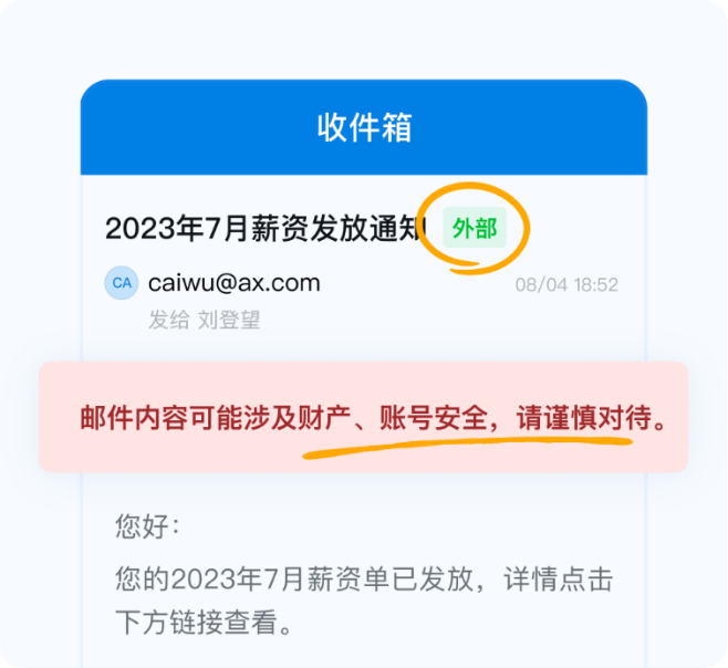 此外,如果是风险更高的可疑邮件,邮件顶部会有醒目的红色风险提示。比如伪装成工资发放通知的外部邮件,甚至诱导员工点击链接、输入银行账号密码的邮件等。